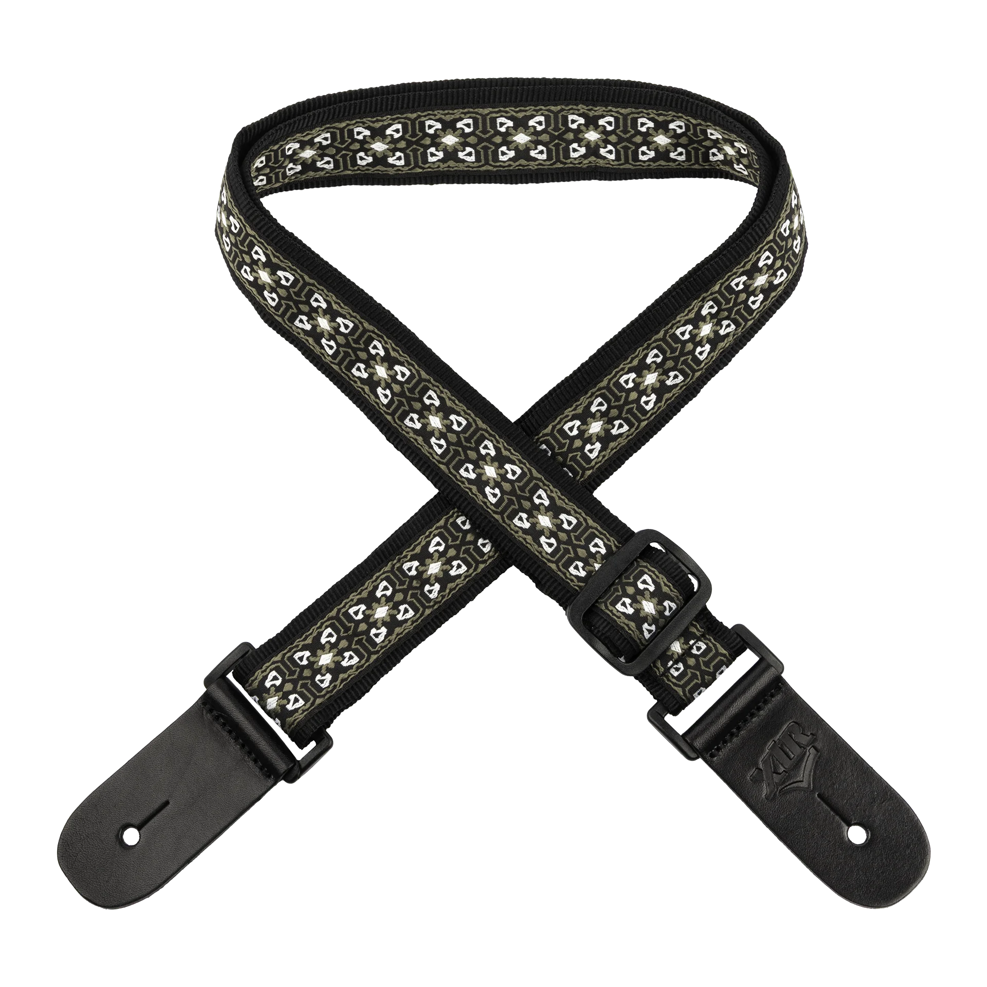 1¼ inch guitar woven, jacquard poly cotton strap with comfortable two layer black poly backing. Premium leather ends. Slider adjustment. White/grey pattern.